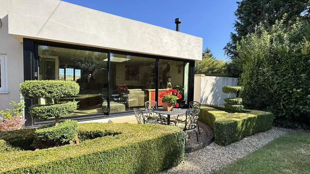 The formal rear garden is a particularly lovely feature of this home, being of very good size and predominantly laid to lawn and enclosed by mature beech hedging to two sides and a low level hedge to the rear boundary affording a view over the adjoining small paddock, fields and valley beyond. There is a relaxation and dining terrace adjacent to the rear of the house with a water feature incorporating lighting, and an outside kitchen incorporating a BBQ with an adjacent griddle and pizza oven with stainless steel hoods and a stainless steel sink with cupboards beneath. On an evening the thoughtfully place outdoor lighting creates a charming atmosphere for entertaining or relaxing.