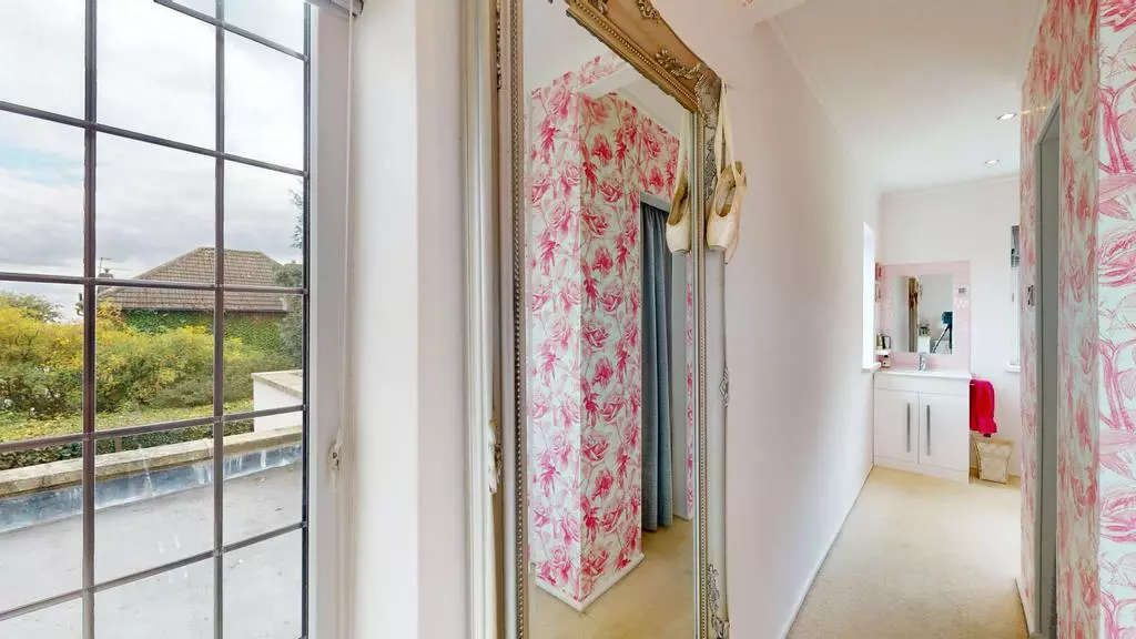 A turned staircase passes a large window to the rear elevation, which enjoys a rural view over the fields and the valley beyond, on its way to the first floor Landing. The property has the benefit of Four Bedrooms, including the Master Suite which incorporates a double bedroom of good size, with an adjacent dressing room with excellent hanging space and a built-in dressing table with storage, which then leads to a Luxury Style En-suite Bathroom with travertine floor tyles and a four-piece suite comprising a jacuzzi bath, shower wet area, WC with concealed cistern and wash basin mounted on a travertine tiled vanity surface. There is also another bedroom which has dressing/sitting/study/play area separated from the bed area by a deep walk-in wardrobe and this would be ideal for as a teenager or child’s bedroom. The Family Shower Room is part tiled in travertine, with a complementing travertine tiled floor and fitted with a three-piece suite comprising a shower enclosure with travertine tiled interior, vanity wash basin and low-suite WC.