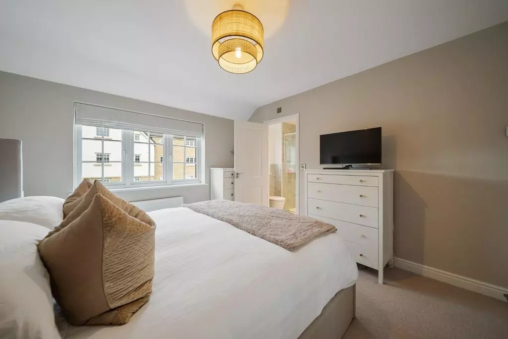 The first floor landing provides loft access (boarded for storage) and a useful cupboard. The master bedroom is a generous size, complete with quality fitted wardrobes and a stylish ensuite with a walk-in shower and modern vanity unit. Three further well-proportioned bedrooms make this a truly versatile family home. The house bathroom is beautifully fitted with a contemporary three-piece suite, including a bath with shower over, pedestal basin, and low flush WC, all complemented by modern tiling and a ladder-style radiator.