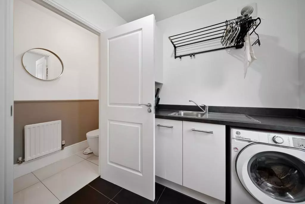 Step through the composite front door into a welcoming entrance vestibule with tiled flooring and stairs leading to the first floor. From here, the spacious lounge opens up as a bright and comfortable reception room with plenty of space for relaxing. At the heart of the home, the open-plan kitchen diner is fitted with sleek gloss-finish units, integrated appliances, and a pull-out larder. Flooded with natural light, it provides the perfect setting for family gatherings or entertaining, with French doors leading out to the garden. A handy understairs cupboard and tiled flooring complete the space. A separate utility room offers additional storage and space for laundry appliances, while a downstairs guest WC adds extra convenience. The ground floor also benefits from a versatile home study, created from a partial garage conversion, ideal for working from home in comfort and style.