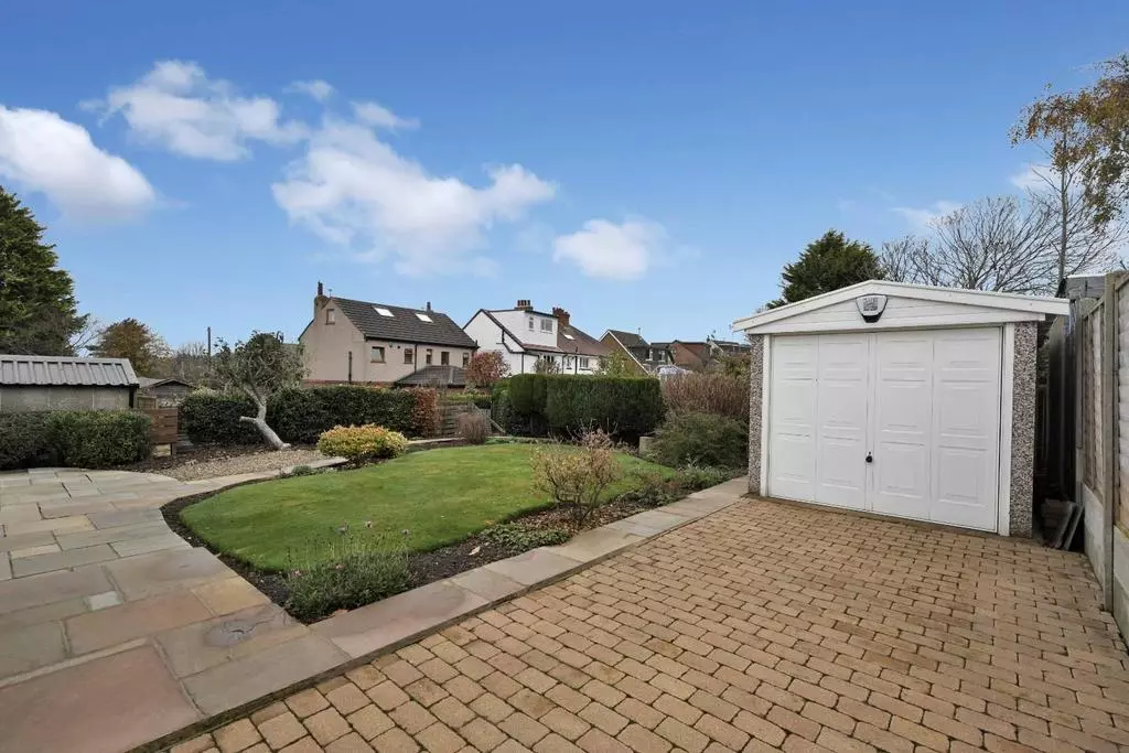 Outside, a spacious block-paved driveway offers ample off-street parking, leading to a detached garage. The front garden is designed for easy maintenance with gravel areas and mature hedging. At the rear, the garden provides a paved terrace, lawn, and gravel sections, bordered by mature hedging and planting that add both beauty and privacy.